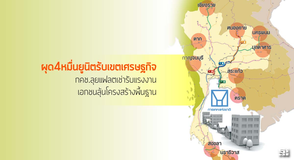 เขตเศรษฐกิจพิเศษชายแดน 10 จังหวัด ร้อนฉ่า! ที่อยู่อาศัยแนวราบ-แนวสูงรับแรงงานเฮละโล กคช.ชูแผนสร้างอาคารพักอาศัยเช่าถูก 4 หมื่นหน่วย ภายในปี 2560-2561 จับเข่าคุยกรมธนารักษ์-กนอ. หาที่ดินรัศมีใกล้นิคมอุตสาหกรรม-การคมนาคมสะดวก ด้านนายกฯจัดสรร ชี้เอกชนตั้งท่ารอโครงสร้างพื้นฐานพร้อม คาดอีก 3 ปีข้างหน้าเดินหน้าลุย