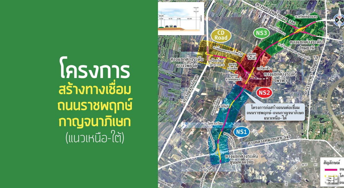 โครงการดังกล่าวนี้กรมทางหลวงชนบท(ทช.)เป็นเจ้าของ เพื่อเชื่อมโยงโครงข่ายให้สมบูรณ์ยิ่งขึ้น ทช.จึงได้ดำเนินโครงการก่อสร้างถนนต่อเชื่อมถนนราชพฤกษ์-ถนนกาญจนาภิเษก (แนวเหนือ-ใต้) ปัจจุบันอยู่ระหว่างการเข้าปรับพื้นที่เตรียมการก่อสร้างและเตรียมทรายถมคันทางช่วงปลายเดือนมิถุนายนนี้ โดยแบ่งออกเป็น 4 สัญญา ดังนี้ สัญญาที่ 1 (ตอน NS1) ก่อสร้างถนนลาดยางผิวแอสฟัลต์คอนกรีต ไป-กลับ รวม 6 ช่องจราจร ระยะทาง 5.2 กิโลเมตร พร้อมก่อสร้างทางแยกต่างระดับขุนมหาดไทย จำนวน 1 แห่ง งานก่อสร้างสะพานข้ามคลองพระอุดม 1 แห่ง งานก่อสร้างสะพานข้ามคลองเกาะเกรียง 1 แห่ง งานก่อสร้างสะพานลอยคนเดินข้าม 1 แห่ง ใช้งบประมาณในการก่อสร้าง จำนวน 1,604 ล้านบาท