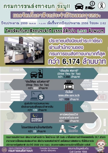 กรมการขนส่งทางบก ระบุสามารถจัดเก็บภาษีรถประจำปีในเขตกรุงเทพมหานคร ประจำปีงบประมาณ 2559 (ต.ค.58 – ก.ย.59) ได้กว่า 8,548 ล้านบาท เพิ่มขึ้นจากปีงบประมาณก่อนร้อยละ 2.62 แจงประชาชนยังนิยมใช้บริการชำระภาษีรถที่สำนักงานของกรมการขนส่งทางบกมากที่สุด พร้อมยกระดับมาตรฐานการบริการเพื่อให้ประชาชนได้รับความสะดวกมากยิ่งขึ้น