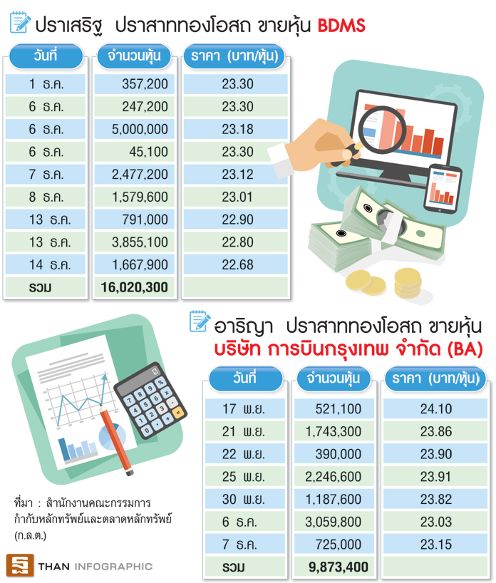 “ปราเสริฐ-อาริญา ปราสาททองโอสถ” ขายหุ้น BDMSและ BA ออกมามากในเดือนธันวาคม รวม 601 ล้านบาท นำเงินจ่ายหนี้แบงก์ไทยพาณิชย์ที่กู้มาซื้อหุ้น
