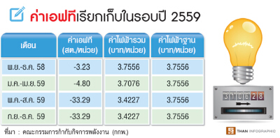 แหล่งข่าวจากคณะกรรมการกำกับกิจการพลังงาน(กกพ.) เปิดเผยว่า ในการพิจารณาค่าเอฟทีในงวดเดือนมกราคม-เมษายน 2560 นั้น มีความเป็นไปได้ที่ค่าเอฟทีจะปรับตัวสูงขึ้น หรือติดลบลดลงจากระดับ 33.29 สตางค์ต่อหน่วย เนื่องจากยังมีค่าเอฟทีกว่า 10 สตางค์ต่อหน่วย ที่สะสมมาตั้งแต่งวดเดือนพฤษภาคม-สิงหาคม 2559 ยังไม่สามารถเรียกเก็บได้ในงวดเดือนกันยายน-ธันวาคม 2559 ประกอบกับแนวโน้มความต้องการใช้ไฟฟ้าที่เพิ่มขึ้น บวกกับราคาค่าเชื้อเพลิงที่ปรับตัวสูงขึ้นในช่วงปีหน้า รวมทั้งการจ่ายเงินอุดหนุนเพิ่มขึ้นจากการรับซื้อไฟฟ้าจากพลังงานหมุนเวียน ที่จะทยอยจ่ายไฟฟ้าเข้าระบบตั้งแต่ช่วงปลายปีนี้เป็นต้นไป รวมเป็นค่าเอฟทีไม่ต่ำกว่า 20 สตางค์ต่อหน่วย
