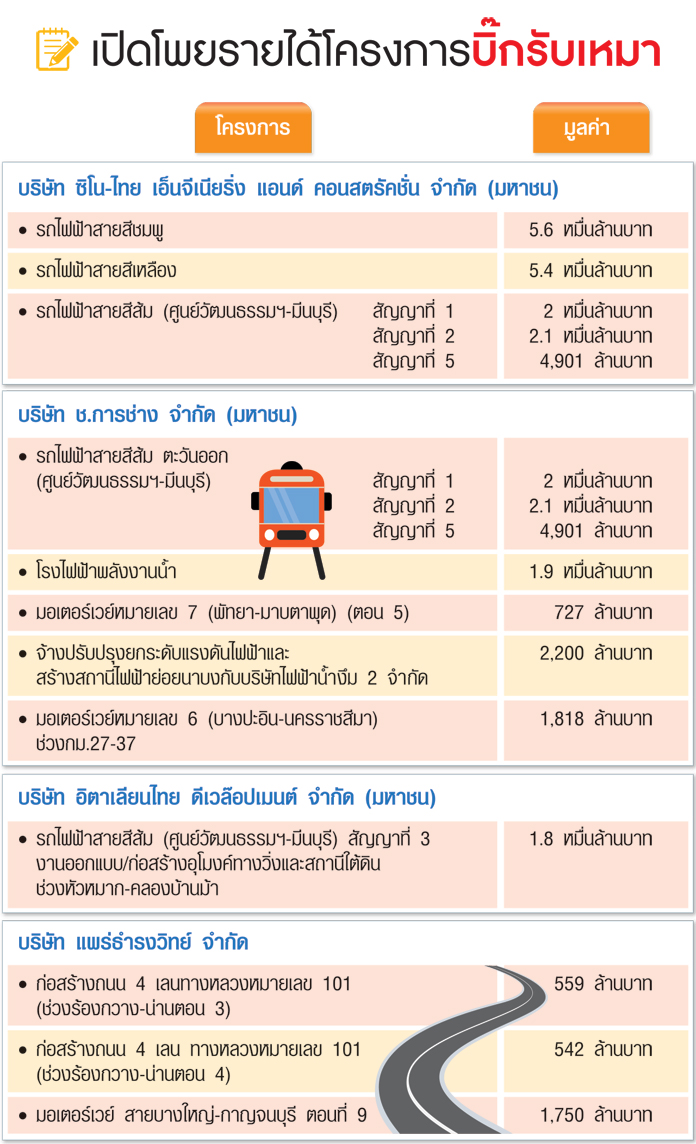 แม้ว่าในปี 2559 คณะรัฐมนตรี(ครม.) อนุมัติให้ดำเนินการได้เพียง 13 โครงการคิดเป็นวงเงินลงทุนกว่า 5.25 แสนล้านบาท ส่วนที่เหลืออีก 7 โครงการโยกไปดำเนินการในปี 2560 แต่ก็ส่งผลให้วงการธุรกิจรับเหมาก่อสร้างของไทยคึกคักขึ้นมาทันที หลายค่ายรับเหมาโดยเฉพาะระดับชั้นพิเศษเข้าร่วมประมูลกันพร้อมหน้า ไม่ว่าจะเป็นโครงการรถไฟทางคู่เส้นทางฉะเชิงเทรา-คลองสิบเก้า-แก่งคอย วงเงินกว่า 1.1 หมื่นล้านบาท ที่บริษัท ซิโน-ไทย เอ็นจีเนียริ่ง แอนด์ คอนสตรัคชั่น จำกัด(มหาชน) ชนะการประมูล เช่นเดียวกับเส้นทางชุมทางถนนจิระ-ขอนแก่น วงเงินกว่า 2.38 หมื่นล้านบาท ที่บริษัท ช.การช่าง จำกัด(มหาชน) ชนะการประมูลโกยรายได้ไปก่อนรายอื่นๆ