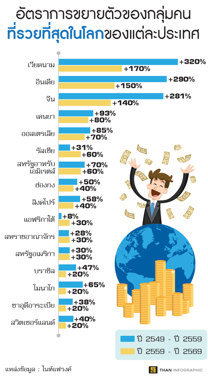 รายงานของไนท์แฟรงค์ ระบุว่าคนรวยระดับมหาเศรษฐีของเวียดนามกลุ่มนี้เพิ่มขึ้น 320 % ในช่วงปี 2549 – 59 นับเป็นอัตราที่สูงที่สุดของโลกแซงประเทศอินเดีย ซึ่งมีอัตราเพิ่มขึ้น 290 % และประเทศจีนซึ่งมีอัตราเพิ่มขึ้น 281 %