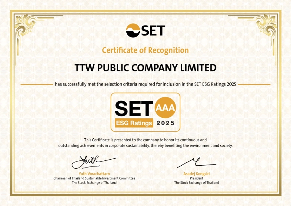 บริษัท ทีทีดับบลิว จำกัด (มหาชน) หรือ TTW ได้รับการประเมินหุ้นยั่งยืน “SET ESG Rating” ในระดับสูงสุด AAA ประจำปี 2568 จากตลาดหลักทรัพย์แห่งประเทศไทย โดยเป็น 1 ใน 265 บริษัทจดทะเบียนที่ผ่านการคัดเลือกและได้รับการประเมินหุ้นยั่งยืน SET ESG Ratings แสดงถึงความมุ่งมั่นในการพัฒนาการดำเนินงานด้านความยั่งยืนของบริษัทอย่างต่อเนื่อง โดยนำแนวคิดด้านความยั่งยืนเข้าเป็นส่วนหนึ่งในกระบวนการดำเนินธุรกิจครอบคลุม ESG ทั้งมิติสิ่งแวดล้อม สังคม เศรษฐกิจ และธรรมาภิบาล