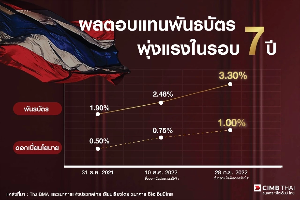 “พอหันกลับมามองที่ตลาดตราสารหนี้ มีโอกาสที่เกิดขึ้นแล้วและไม่ต้องรอ โดยมีตัวเร่งก็คือ เงินเฟ้อ ซึ่งผลตอบแทนสะท้อนภาพการขึ้นดอกเบี้ยนโยบายของไทยไปล่วงหน้าแล้ว จากสิ้นปี 2564 ผลตอบแทนพันธบัตร 10 ปี อยู่ที่ระดับ 1.90% แต่เมื่อธนาคารแห่งประเทศไทยขยับดอกเบี้ยนโยบายเพียง 2 ครั้ง หรือเท่ากับ 0.50% แต่ตลาดกลับตอบรับ โดยผลตอบแทนเพิ่มขึ้นถึง 1.40% หรือมาอยู่ที่ระดับ 3.30% จึงเป็นโอกาสที่น่าสนใจสำหรับนักออมเงิน เพราะหมายถึงดอกเบี้ยเข้ากระเป๋าที่เพิ่มขึ้น บนผลิตภัณฑ์ที่มีความเสี่ยงต่ำอย่างพันธบัตร/หุ้นกู้คุณภาพดี หรือนักลงทุน ก็สามารถเพิ่มสัดส่วนการลงทุน เพื่อลดความผันผวนของพอร์ตได้”
