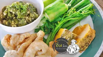 ซึ่งเขาเอาขนุนอ่อนๆทั้งลูกไปเผา แกะเอามาตำในครกใส่เค็มน้ำปู๋ (ปูนาตำเคี่ยวเกลือและใบตะไคร้) เผ็ดพริกย่างพริกคั่ว และ หนังปอง คือว่าหนังควายเผาขูดไหม้ทิ้งทำให้พอง (ปอง) เคี้ยวสากลิ้น