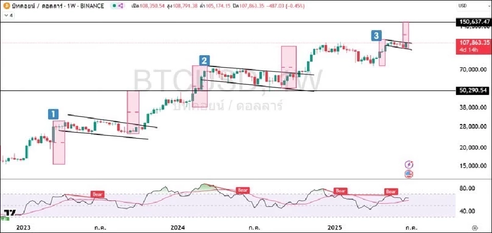 จากบทความก่อนหน้านี้เรื่อง “BTCUSD ฮาฟวิ่งแล้ว ทำไมยังไม่วิ่ง” ที่มองว่าราคา btcusd จะไปถึง 100k ณ วันนี้ ก็มาถึงแล้วนะครับ วันนี้วันที่ 07/07/68 ราคาอยู่ที่ 109,500$ เรียกเป็นไปตามที่บอกไว้แล้วนะครับ แต่วันนี้มานำเสนออีกครั้งในมุมมองของเทคนิคคอล จากการที่กราฟทำฟอร์ม flag pattern ซ้ำมาแล้ว 2 ครั้งในรอบสองปี วันนี้เหมือนจะฟอร์มแพทเทิร์นนี้อีกครั้งเป็นครั้งที่สาม