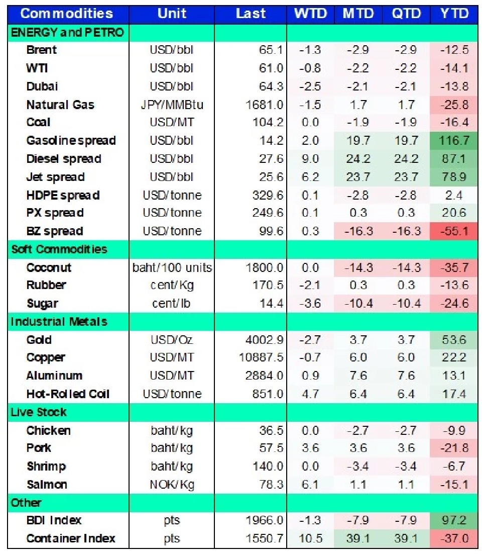 ราคาน้ำมันดิบสัปดาห์ที่ผ่านมาย่อตัวเล็กน้อย (-1%w-w) หลังจากดีดขึ้นเด่นในสัปดาห์ก่อน โดยแรงกดดันยังคงมาจากภาวะอุปทานที่อยู่ในระดับสูง ผสานกับความไม่แน่นอนของเศรษฐกิจโลก ส่วนด้านค่าการกลั่นยังปรับขึ้น สอดคล้องกับส่วนต่างทั้งน้ำมันดีเซล น้ำมันก๊าซโซลีน และน้ำมันเครื่องบินที่ฟื้นตัวที่ปรับขึ้น