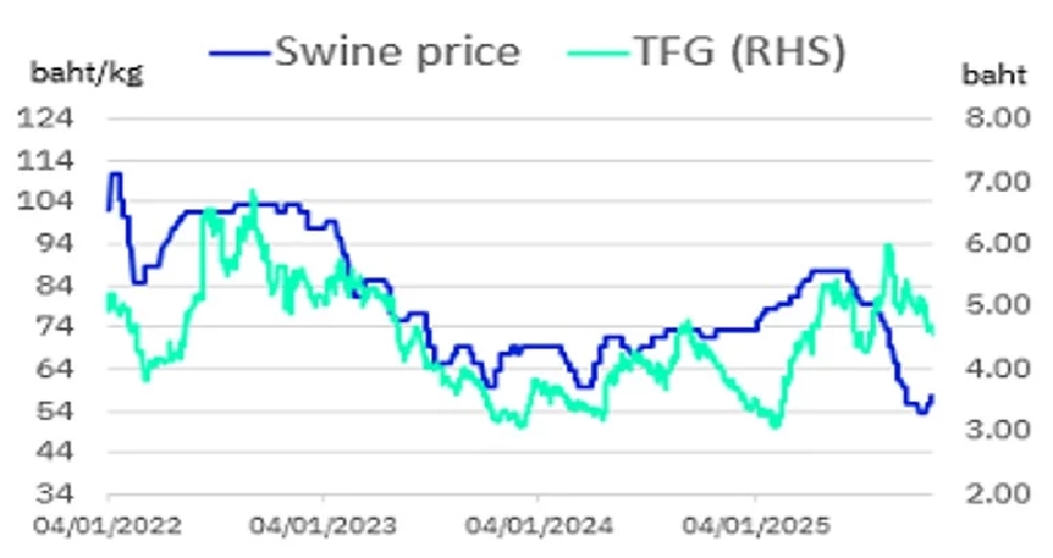 ด้านราคาเนื้อสัตว์ในสัปดาห์ที่ผ่านมาพบว่า ราคาไก่ และกุ้งทรงตัว ขณะที่ราคาหมู +3.6%w-w ปรับขึ้นเป็นสัปดาห์ที่สองติดต่อกัน หลังผ่านเทศกาลกินเจ อาจสะท้อนว่าราคาหมูน่าจะผ่านจุดต่ำสุดไปแล้ว เป็นบวกต่อนักลงทุนระยะกลาง-ยาว น่าทยอยสะสมหุ้นเนื้อหมู (TFG)