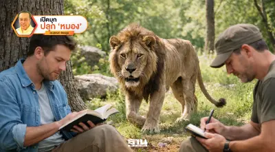 น่าแปลกใจที่สิงโตไม่กินคนที่สอง สิงโต อ่านขาดว่ าคนที่สองยังสงสัย จึงบอกเล่าให้เข้าใจว่า “แม้แต่ราชาแห่งป่าอย่างข้าก็ยังรู้ว่า คนอ่านหนังสือจะย่อยข้อมูลได้ ข้าเคี้ยวไอ้คนแรกสบายปากดีแท้ ข้าไม่กินนักเขียนอย่างเอ็ง เพราะว่า นักเขียนมักจะเกร็งตัวบ่อย วันนี้เอ็งก็นั่งเกร็ง รีบเขียนจะเอาต้นฉบับไปส่ง วันหน้าปลื้มใจได้รับรางวัลพ็อกเก็ตบุ๊คดีเด่น เดินเกร็ง ฟอร์มจัด ข้าจะเคี้ยวแกให้ฟันข้าหักไปทำไม” (ฮา)
