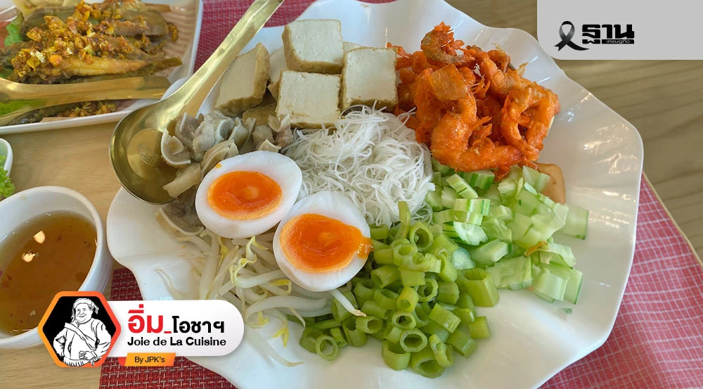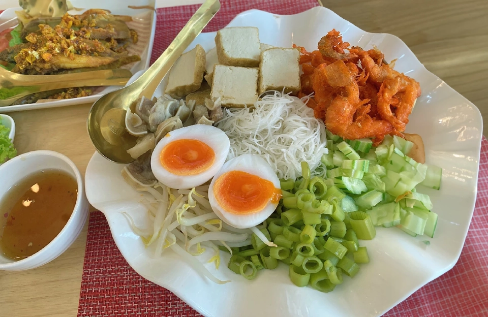 รับประทานเพลินๆกับแกงเหลืองซึ่งที่จริงแล้วสีมันเหลืองแต่รสชาติเปรี้ยว(ส้ม)เผ็ดใส่ปลากะพงน้ำกร่อยชิ้นโตโต ราดข้าวสวยเม็ดเต่งหุงมาร้อนๆ พวกทอดมันก็มี สามชั้นทอดน้ำปลาก็มา รับประทานด้วยน้ำจิ้มซีฟู้ดปั่นละเอียด