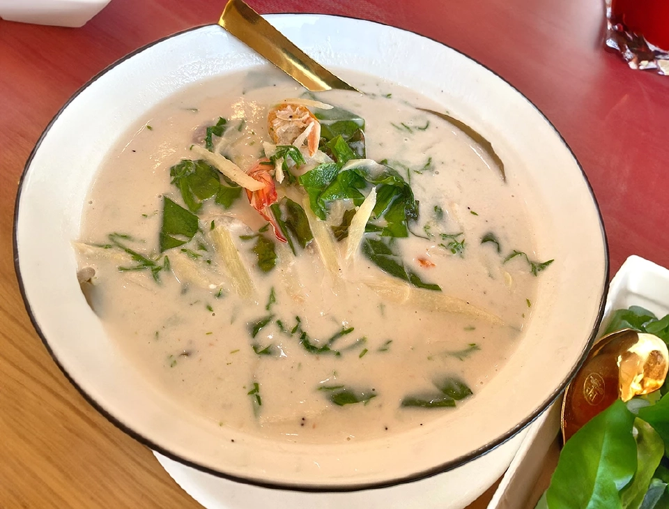 อันว่าปลาทรายนี้ ถ้ายังมีก้างอยู่เค้าเรียกปลาทรายแต่ถ้าว่าเลาะก้างกลางออกแล้วเหลือแต่ฟิเลต์ พอโดนน้ำร้อนลวกแล้วก็จะสุกเต่งขาวเหมือนกับเห็ดโคนก็จึงหาเรื่องเรียกกันใหม่ว่าปลาเห็ดโคน! ส่วนกะทิที่เขาคั้นใหม่สดๆนั้นจะต้องเอามาแกงกับยอดใบเหลียงซึ่งทางร้านเก็บเองคัดเองเอาแต่ที่อ่อนอ่อน ใส่ทั้งหอมแดงทุบตะไคร้ฝานใส่ทั้งกุ้งแห้งใส่ทั้งกุ้งสด ซดแล้วชื่นใจ