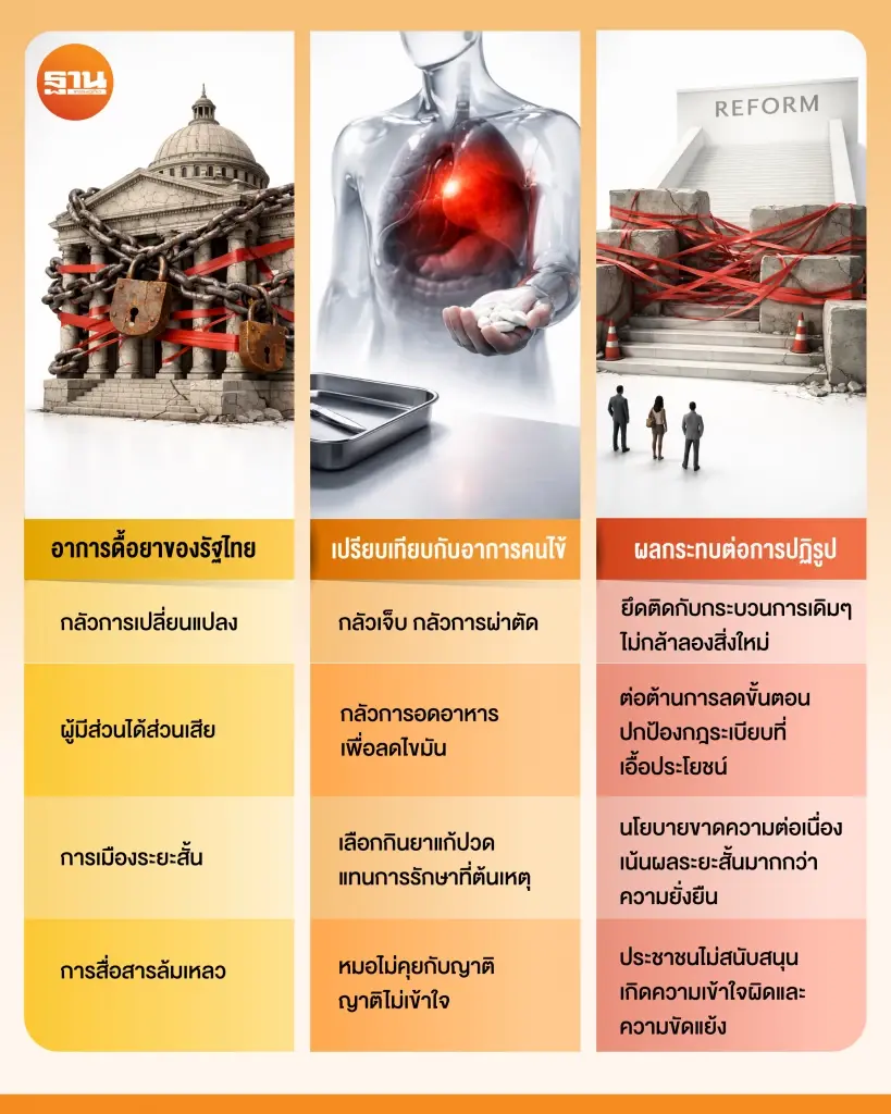 ก่อนจะลงมีด ศัลยแพทย์ที่ดีต้องเข้าใจกายวิภาคและสภาวะของคนไข้อย่างถ่องแท้ “รัฐไทย” ในฐานะคนไข้ มีอาการดื้อยาและต่อต้านการเปลี่ยนแปลงที่เกิดจากหลายปัจจัยซ้อนกัน ซึ่งเปรียบได้กับโรคประจำตัวที่ทำให้การผ่าตัดมีความเสี่ยงสูง