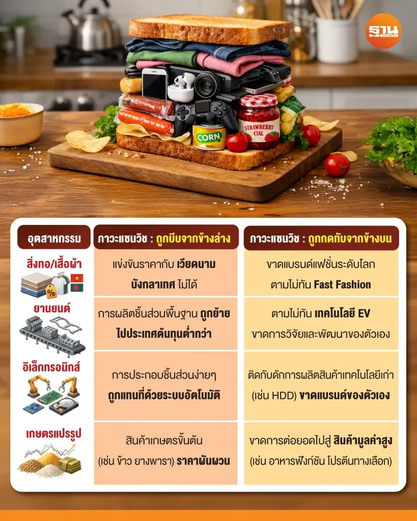 ไม่ใช่แซนวิชที่น่าอร่อยในร้านกาแฟหรู แต่เป็นแซนวิชที่ถูกบีบอัดจนไส้แทบทะลัก ประเทศไทยในวันนี้ กำลังตกอยู่ในสภาวะที่เรียกว่า “ภาวะแซนวิชทางเศรษฐกิจ” (Economic Sandwich) อย่างเต็มรูปแบบ ขนมปังแผ่นล่างคือประเทศคู่แข่งที่ “ต้นทุนต่ำกว่า” อย่างเวียดนามและอินโดนีเซีย ที่พร้อมจะแย่งชิง การลงทุนและการผลิตในสินค้าที่ไม่ซับซ้อนไปจากเราทุกเมื่อ ส่วนขนมปังแผ่นบนคือประเทศผู้นำด้านเทคโนโลยีอย่างเกาหลีใต้ ไต้หวัน หรือจีน ที่ทิ้งห่างเราไปไกลในด้านนวัตกรรมและสินค้ามูลค่าสูง