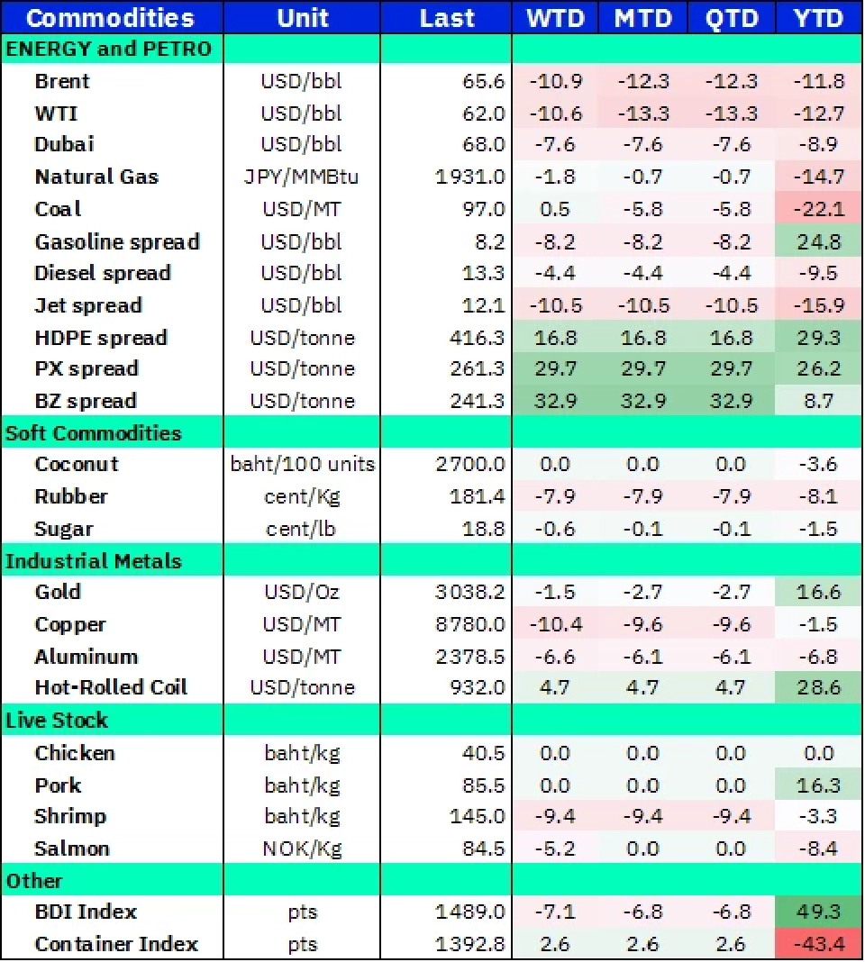 ราคาน้ำมันดิบโลกปรับฐานแรงกว่า -10% ในสัปดาห์ที่ผ่านมา ตอบรับความกังวลทั้งด้านอุปสงค์น้ำมันหลังทรัมป์ประกาศนโยบายภาษีตอบโต้ทั่วโลกที่รุนแรงมากกว่าคาด ผสานกับแรงกดดันด้านอุปทานจากมติที่ประชุม OPEC+ จะปรับเพิ่มกำลังการผลิต 411,000 บาร์เรล/วันตั้งแต่เดือนพ.ค. ซึ่งเพิ่มขึ้นจากแผนการเบื้องต้นที่ระดับ 135,000 บาร์เรล/วัน