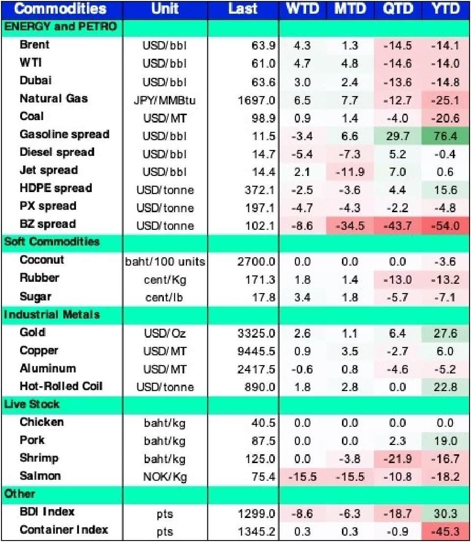สำหรับราคาเนื้อสัตว์ทั้งหมู, ไก่ และกุ้งในสัปดาห์ที่ผ่านมายังทรงตัว ท่ามกลางราคาสินค้าเกษตรที่ใช้เป็นอาหารสัตว์ เช่น ข้าวโพด และกากถั่วเหลืองที่ยังชะลอตัวต่อเนื่อง โดยสัปดาห์ที่ผ่านมาลดลงอีก -4.3% และ -1.0% ตามลำดับ ดังนั้นถือเป็นปัจจัยบวกต่องบของกลุ่มเนื้อสัตว์ที่คาดว่าจะดีต่อเนื่องในช่วง 2Q25