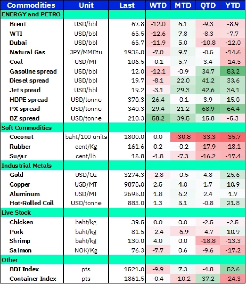 ด้านราคาสินค้าเกษตรส่วนใหญ่ยังคงปรับลดลงต่อเนื่อง ทั้ง ข้าวสาลี (-7.3%), กากถั่วเหลือง (-4.6%), ข้าวโพด (-2.6%) และน้ำมันปาล์ม (-2.1%) ส่วนราคาเนื้อสัตว์ พบว่า ราคาหมูยังคงปรับตัวลดลง -2.4%w-w ลดต่อเนื่องเป็นสัปดาห์ที่ 3 ติดต่อกัน จากอุปทานที่เพิ่มมากขึ้น และสภาพอากาศเข้าสู่ช่วงฤดูฝนคาดเพิ่มแรงกดดันต่อหุ้นกลุ่มเนื้อหมูต่อเนื่อง