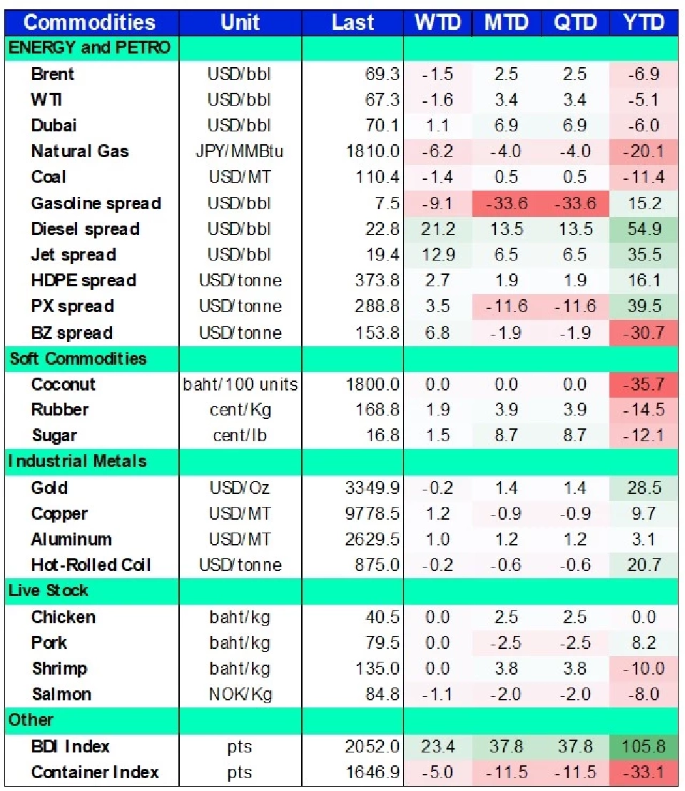 ค่าระวางเรือปรับขึ้นเด่นในช่วงสั้น (+23%w-w) ทะลุ 2,000 จุด ทำจุดสูงสุดรอบ 10 เดือน หนุนจากจีนเร่งสต๊อกแร่กลางปีรับนโยบายกระตุ้นอสังหาฯแต่อาจเริ่มผ่อนในช่วง 3Q25 ส่วนดัชนี Container -5% ยังพักฐานหลังผ่านจุดสูงสุดในช่วงเดือน มิ.ย. แต่ยังต้องติดตามสถานการณ์ในทะเลแดง อาจเป็นแรงหนุนได้