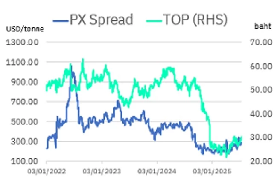 ในขณะที่ด้านส่วนต่างผลิตภัณฑ์จากการกลั่นในสัปดาห์ที่ผ่านมาพบว่า ส่วนต่างน้ำมันแก๊สโซลีน ลดลง -9% ในขณะที่ส่วนต่างน้ำมันดีเซล และส่วนต่างน้ำมันเครื่องบิน ปรับขึ้น +21%, +13% ตามลำดับ ส่วนฝั่งปิโตรเคมี พบว่า ส่วนต่างทั้งในสายโอเลฟินส์ และอะโรเมติกส์ ปรับตัวขึ้น ราว 3-6% ดังนั้นอาจเพิ่มแรงเก็งกำไรในหุ้นกลุ่มโรงกลั่นและปิโตรเคมี (TOP, IVL)