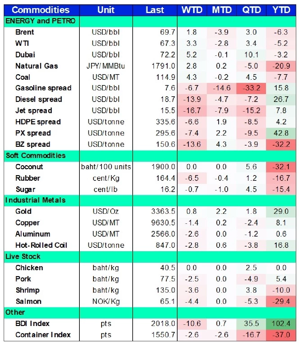 ราคาน้ำมันดิบโลกปรับขึ้นเฉลี่ย 3% ขานรับการผ่อนคลายสงครามการค้า ผสานกับการที่โดนัล ทรัมป์ ขู่ว่าจะใช้มาตรการต่างๆ เพื่อกดดันให้รัสเซียเร่งยุติสงครามในยูเครน ขณะที่ส่วนต่างผลิตภัณฑ์กลั่นย่อตัวลง ทั้งก๊าซโซลีน, ดีเซล และน้ำมันเครื่องบิน เช่นเดียวกับส่วนต่างปิโตรเคมี ทั้งสายอะโรเมติกส์ และโอเลฟินส์ ที่ปรับลดลงเช่นกัน
