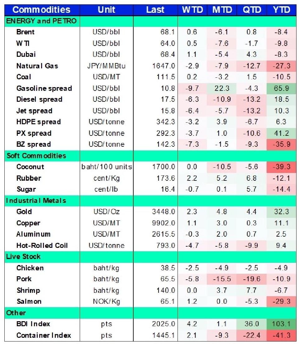 ราคาสินค้าเกษตรค่อนข้างผสมผสาน โดย ราคาข้าวโพด, ยางพารา และข้าวสาลี ขยับขึ้น +2.5%, +2.2%, +1.3% ตามลำดับ ขณะที่กากถั่วเหลือง และน้ำมันปาล์มย่อตัวลง ส่วนด้านราคาเนื้อสัตว์สัปดาห์ที่ผ่านมาพบว่าราคาหมู, ไก่ ยังปรับลดลงต่อเนื่อง -5.8%, -2.5% ตามลำดับ ดังนั้นยังแนะหลีกเลี่ยงหุ้นกลุ่มเนื้อสัตว์ ส่วนด้านราคาปลาแซลมอนยังปรับขึ้นเป็นสัปดาห์ที่ 3 ติดต่อกัน สู่ระดับ 65.1 NOK/Kg.