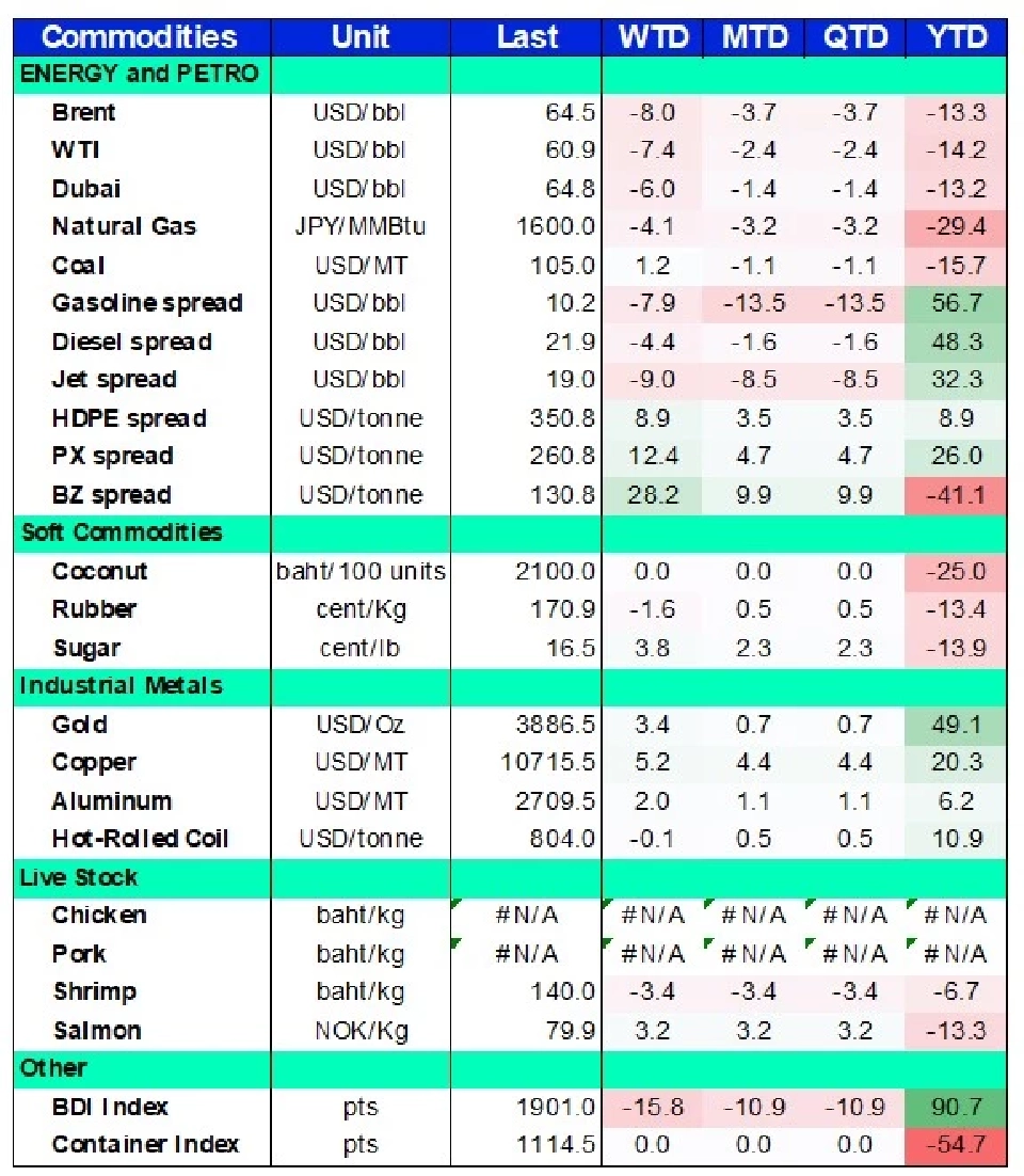 ส่วนด้านส่วนต่างน้ำมันก๊าซโซลีน, ส่วนต่างดีเซล และส่วนต่างน้ำมันเครื่องบินก็ชะลอลงเช่นกัน อาจเพิ่มแรงกดดันต่อกลุ่มโรงกลั่น ในขณะที่ส่วนต่างปิโตรเคมีฟื้นเด่นทั้งสายโอเลฟินส์และอะโรเมติกส์ คาดกระตุ้นแรงเก็งกลุ่มปิโตรเคมี แนะสะสม SCC, PTTGC