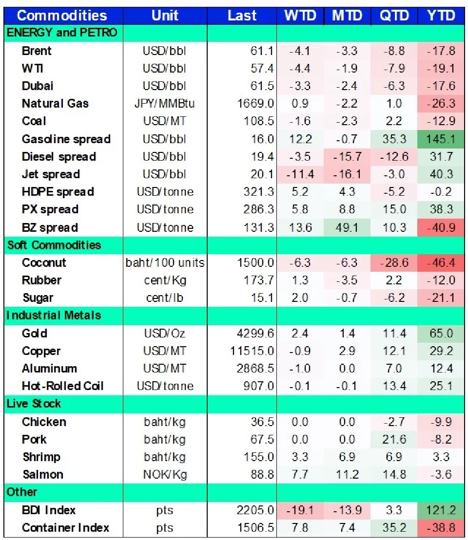 ด้านราคาทองคำ ยังปรับตัวขึ้นดีในสัปดาห์ที่ผ่านมา โดย +2.4% สู่ระดับ 4,299.6 USD/Oz ขณะที่โลหะมีค่าอื่นๆ อาจย่อลงเล็กน้อยแต่ยังอยู่ในระดับสูง เช่น ราคาทองแดง และอลูมิเนียม