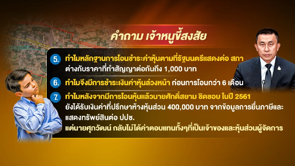 5. ทำไมจึงมีการชำระเงินค่าหุ้นล่วงหน้าก่อนการโอนกว่า 6 เดือน แม้ว่า นายศักดิ์สยาม จะชี้แจงว่า ความจริงแล้วการซื้อขายหุ้นไม่จำเป็นว่าจะต้องชำระเงินและโอนเงินทันที เพราะมีสัญญาอยู่ และขอยืนยันว่า มีการซื้อขายโอนหุ้นจริง ไม่มีนอมินี แต่ไม่น่าจะพอ