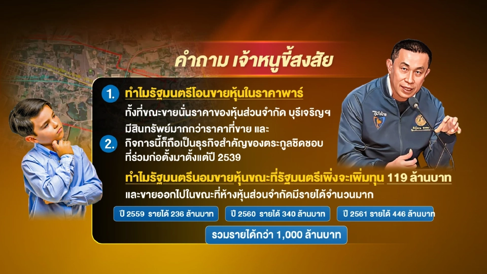 1.ทำไมรัฐมนตรีโอนขายหุ้นในราคาพาร์ ทั้งที่ขณะขายนั่นราคาของหุ้นส่วนจำกัด บุรีเจริญฯ มีสินทรัพย์มากกว่าราคาที่ขาย และกิจการนี้ก็ถือเป็นธุรกิจสำคัญของตระกูลชิดชอบที่ร่วมก่อตั้งมาตั้งแต่ปี 2539