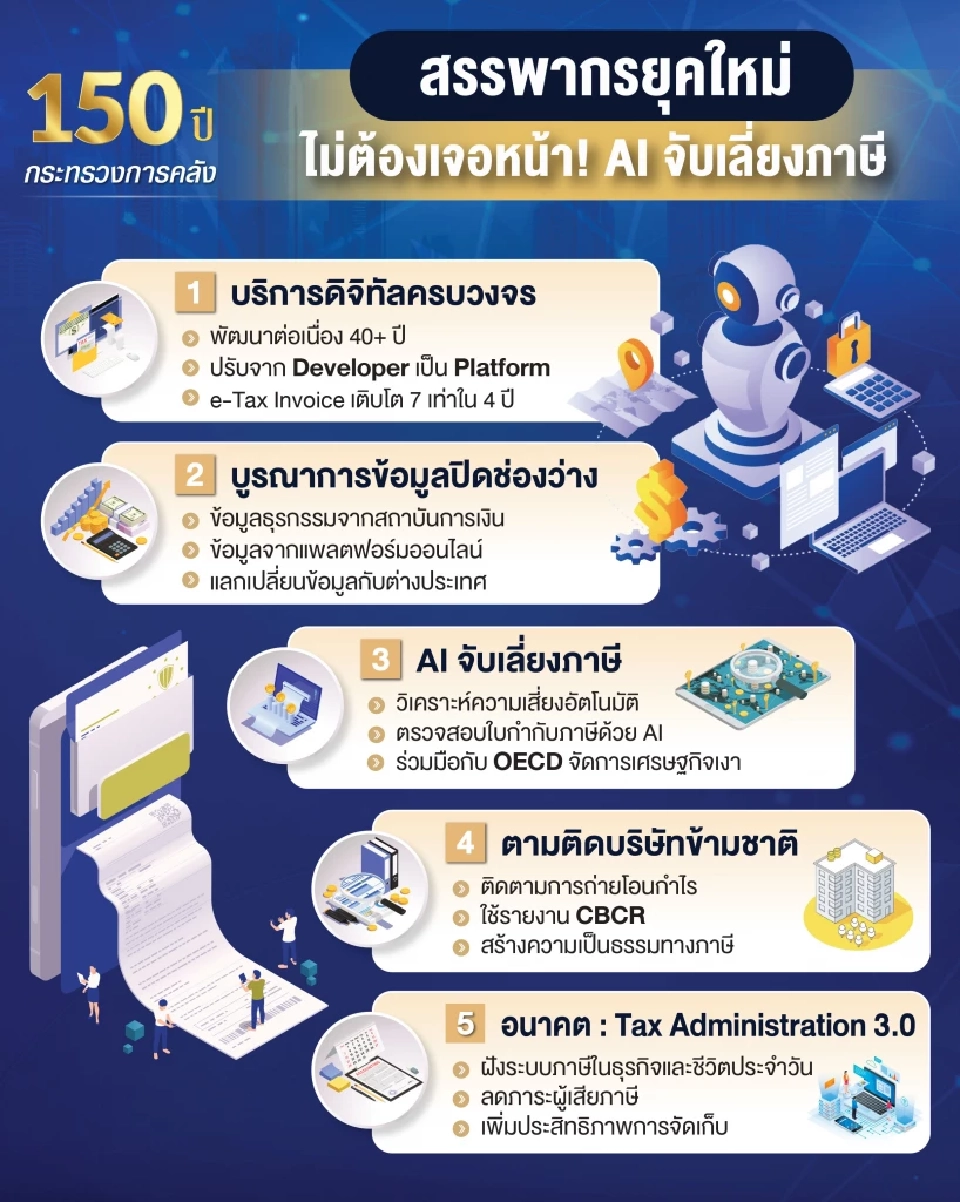 กระทรวงการคลังโดยกรมสรรพากรเดินหน้าปฏิวัติระบบการให้บริการด้วยเทคโนโลยีดิจิทัลล้ำสมัย พร้อมยกระดับการป้องกันการหลบเลี่ยงภาษีด้วยการประยุกต์ใช้ Big Data และปัญญาประดิษฐ์ (AI) เพื่อสร้างระบบภาษีที่มีประสิทธิภาพ โปร่งใส และเป็นธรรมสำหรับทุกฝ่าย
