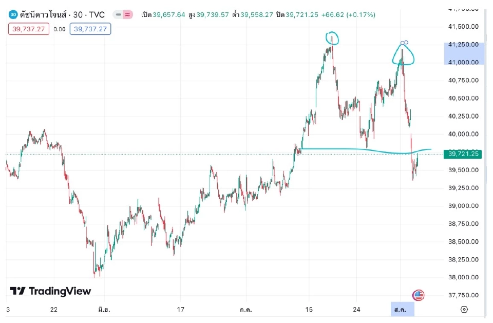 ยกตัวอย่างเช่น ภาพ chart ที่ผมวาดคือ Dow Jones TF 30 MINS มีการทำรูปแบบ double top ซึ่งแปลว่าโอกาสลงต่อยังมี บวกกับข่าวอื่นๆ ที่ทำลาย sentiment นักลงทุน เช่น บริษัทของ Warren Buffet เทขายหุ้น APPL ออกมา เป็นต้น
