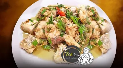 อีกรูปนี้คือเจ๊เก๊กฮวย แกเปิดร้านเก่าเเก่นานเนอยู่เชิงสะพานพระพุทธเลิศหล้าแม่กลอง ใช้ปลากระพงสดจากเรือสับหยาบผัดกระเพรารสจัดจ้าน แก้เผ็ดด้วยผัดผักบุ้ง และไข่เป็ดทอดในน้ำมันหมู