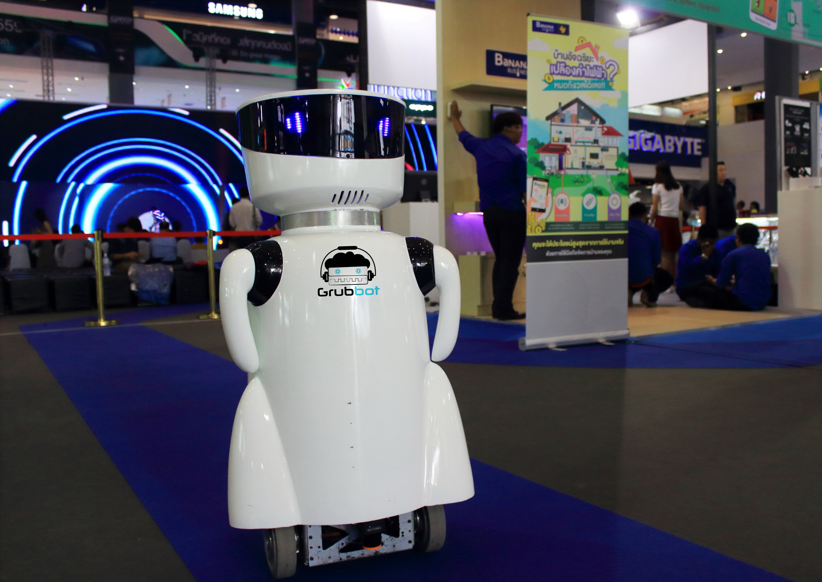 “กรั๊บบอต (GRUBBOT) หุ่นยนต์จอมช้อป เพื่อนคู่คิดชีวิตยุคไทยแลนด์ 4.0 นี้เป็นผลงานนวัตกรรมจากความคิดสร้างสรรค์ของนักศึกษาสามหนุ่มคนรุ่นใหม่ ประกอบด้วย นายเอกพัฒน์ เอกนรพันธ์ นายธารินทร์ ยุทธนาการ นายธิติพงษ์ สุหัตถาพร ชั้นปีที่ 4 ภาควิชาวิศวกรรมการวัดและควบคุม คณะวิศวกรรมศาสตร์ สถาบันเทคโนโลยีพระจอมเกล้าเจ้าคุณทหารลาดกระบัง นับเป็นแรงบันดาลใจของคนรุ่นใหม่ในการออกแบบและสร้างนวัตกรรมผลิตภัณฑ์ที่ตอบสนองการใช้งานตามความต้องการของผู้บริโภค และธุรกิจค้าปลีกซึ่งนับวันจะมีการแข่งขันสูง บทบาทของหุ่นยนต์ต่อชีวิตในอนาคตเพิ่มขึ้นอย่างเห็นได้ชัด ดังที่นักวิทยาศาสตร์และอนาคตศาสตร์ วิเคราะห์ว่า เรากำลังก้าวสู่ยุคการใช้หุ่นยนต์ หรือ เทคโนโลยีระบบอัตโนมัติ AI -Aritificial Intelligence”