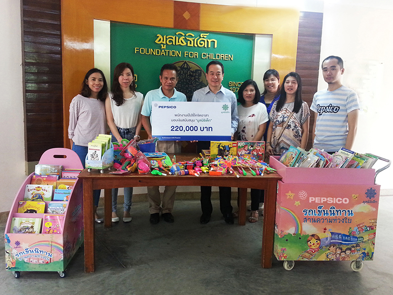 นายจรณชัย ศัลยพงษ์ ผู้อำนวยการฝ่ายบรรษัทสัมพันธ์ บริษัท เป๊ปซี่-โคล่า (ไทย) เทรดดิ้ง จำกัด ผู้ผลิตและจัดหน่ายอาหารและเครื่องดื่มชั้นนำในเครือเป๊ปซี่โค อาทิ เครื่องดื่ม ‘เป๊ปซี่’ และมันฝรั่งทอดกรอบ ‘เลย์’ นำทีมพนักงานมอบเงินจำนวน 220,000 บาทเพื่อสนับสนุน “มูลนิธิเด็ก” ในการดำเนินโครงการ “รถเข็นนิทานเพื่อหอผู้ป่วยเด็กในโรงพยาบาล” ซึ่งจะผลิตรถเข็นที่บรรจุนิทานและหนังสือสำหรับเด็กจำนวนทั้งสิ้น 18 คันเพื่อสร้างความสุขและฟื้นฟูจิตใจให้กับผู้ป่วยเด็กในโรงพยาบาลส่งเสริมสุขภาพตำบลใน 3 จังหวัดชายแดนภาคใต้ โดยมีนายชัยณรงค์ ฉิมชูใจ ผู้อำนวยการโรงเรียนอนุบาลหมู่บ้านเด็กสานรัก มูลนิธิเด็ก เป็นตัวแทนรับมอบ