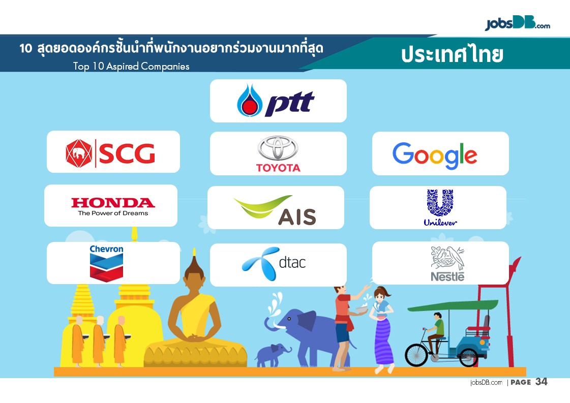 บริษัท จัดหางาน จ๊อบส์ ดีบี (ประเทศไทย) จำกัด เว็บไซต์หางานชั้นนำของเอเชีย เผย 10 อันดับบริษัทที่คนอยากเข้าทำงาน มากที่สุดในประเทศไทย พบว่า 4 ใน 10 ขององค์กรน่าทำงานที่เหล่ามนุษย์ เงินเดือนชาวไทยใฝ่ฝันอยากเข้ าทำงานเป็นบริษัทสัญชาติไทยและยังติด 2 อันดับแรกของบริษัทที่น่าทำงานที่สุดในประเทศไทย