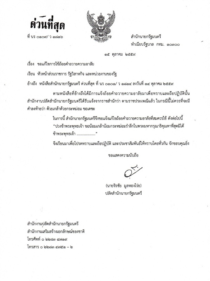 ในการนี้ สำนักนายกรัฐมนตรีจึงขอแจ้งแก้ไขคำถวายอาลัยที่สมควรใช้ ดังต่อไปนี้