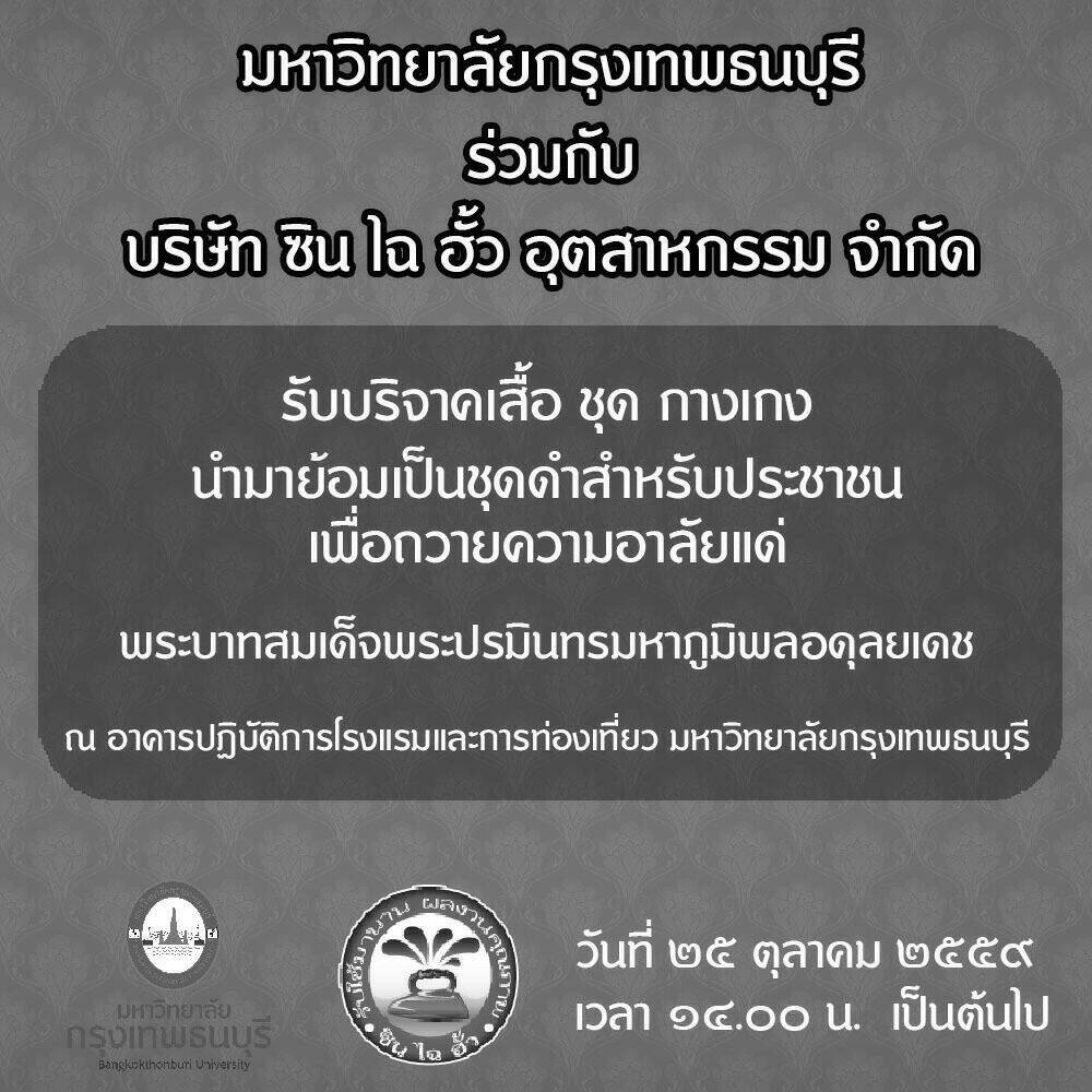 นอกจากนี้มหาวิทยาลัยกรุงเทพธนบุรี ยังได้ร่วมกับ บริษัท ซิน ไฉ ฮั้ว อุตสาหกรรม จำกัด รับบริจาคเสื้อ ชุด กางเกง นำมาย้อมเป็นชุดดำสำหรับประชาชน เพื่อถวายความอาลัยแด่พระสมเด็จพระปรมินทรมหาภูมิพลอดุลยเดช ณ อาคารปฏิบัติการโรงแรมและการท่องเที่ยว มหาวิทยาลัยกรุงเทพธนบุรี ในวันอังคารที่ 25 ตุลาคม 2559 ตั้งแต่เวลา 14.00 น. เป็นต้นไป
