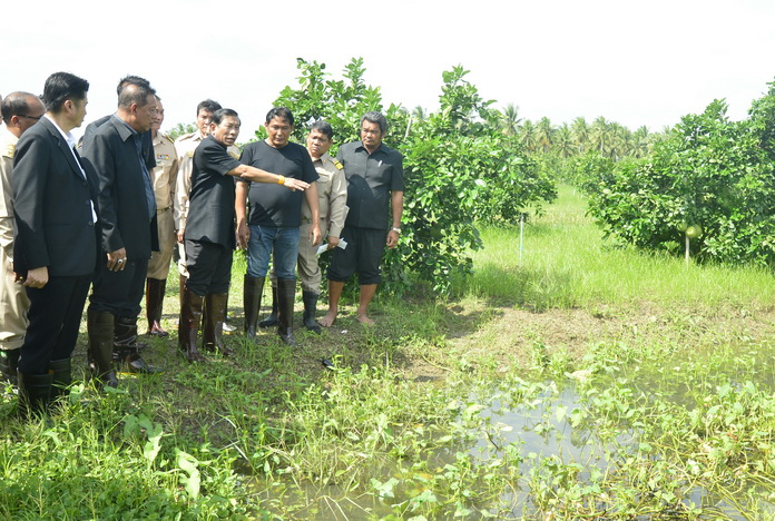 นอกจากนี้ ยังได้พบปะเกษตรกรปลูกส้มโอทับทิมสยาม ซึ่งมีการปลูกแห่งเดียวในประเทศไทย เนื้อที่รวม 2,200 ไร่ ซึ่งได้รับผลกระทบจากน้ำท่วมด้วย จึงได้สั่งการให้กรมชลประทานเร่งระบายน้ำออกจากพื้นที่ โดยกั้นคั้นน้ำรอบพื้นที่ 2,200 ไร่ พร้อมระดมเครื่องสูบน้ำ และ เครื่องผลักดันน้ำ ให้เสร็จภายใน 7 วัน เพื่อรักษาต้นส้มไว้ ซึ่งหากปล่อยนานกว่า 15 วัน อาจจะทำให้ต้นส้มเสียหายได้ จากนั้นได้ไปพบปะกลุ่มเกษตรกรที่ศูนย์วิจัยข้าวนครศรีธรรมราช ได้มอบเสบียงสัตว์ (หญ้าแห้ง) ให้เกษตรกร ซึ่งน้ำท่วมในครั้งนี้ มีสัตว์เลี้ยงได้รับผลกระทบ 270,000 ตัว ใน 3 จังหวัด คือ นครศรีธรรมราช พัทลุง และ สุราษฎร์ธานี ซึ่งได้สั่งการให้กรมปศุสัตว์แจกจ่ายเสบียงสัตว์จากคลังในพื้นที่ ปัจจุบัน แจกไปแล้ว 350,000 กก. ยังมีสำรองอีก 1,100,000 กก.