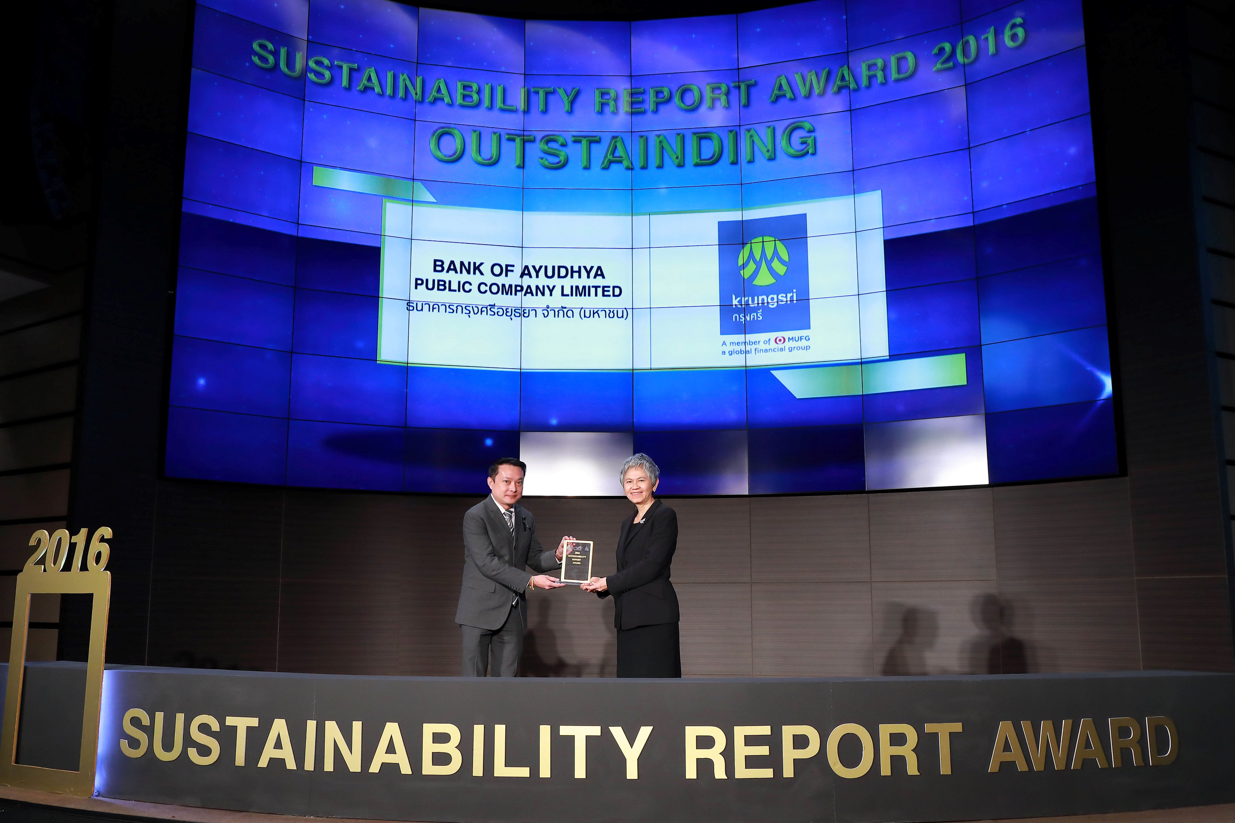 จากรายงานของคณะกรรมการ (Judge Report) พิจารณาตัดสินรางวัลรายงานความยั่งยืน ประจำปี 2559 เพื่อส่งเสริมให้องค์กรธุรกิจเผยแพร่ข้อมูลด้าน ESG เพิ่มเติมจากข้อมูลทางการเงิน มีบริษัทที่ได้รับรางวัลรายงานความยั่งยืน ระดับยอดเยี่ยม 1 บริษัท ระดับดีเยี่ยม 3 บริษัท ระดับดีเด่น 23 บริษัท Recognition 10 บริษัท และรางวัล AWARD OF SUSTAINABLE EXCELLENCE 1 บริษัท จากบริษัทที่ส่งรายงานความยั่งยืนเข้าร่วมโครงการ 124 บริษัท โดยธนาคารกรุงศรีอยุธยา จำกัด(มหาชน) เป็นหนึ่งในองค์กรทีได้รับรางวัลในปีนี้