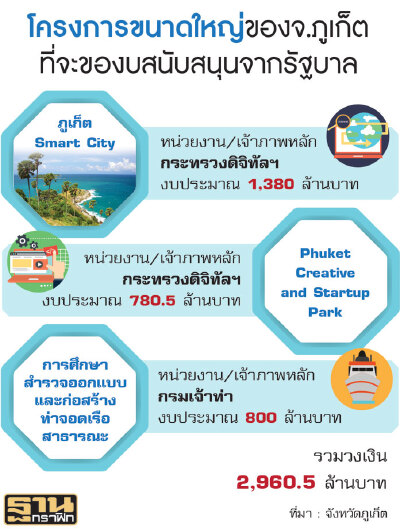 รวมทั้งการขอสนับสนุนงบจากรัฐบาล ซึ่งทางจ.ภูเก็ต ได้ขอให้พล.อ. ธนะศักดิ์ ปฏิมาประกร รองนายกรัฐมนตรี ผลักดันใน 3 โครงการใหญ่ ที่ขับเคลื่อนการพัฒนาของพื้นที่ ในปี 2561 วงเงินราว 2.96 พันล้านบาท อาทิ ภูเก็ต สมาร์ท ซิตี้ การศึกษาสำรวจออกแบบ และก่อสร้างท่าเรือสาธารณะ เพื่อให้ภูเก็ตเป็นศูนย์กลางการท่องเที่ยวทางทะเลระดับโลก (ตารางประกอบ)