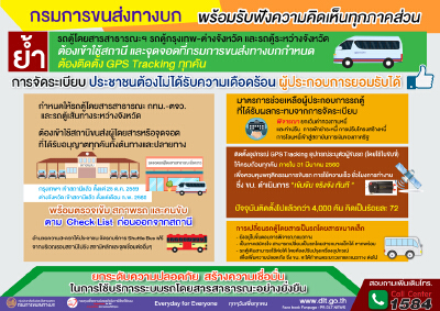 กรมการขนส่งทางบก พร้อมรับฟังความคิดเห็นทุกภาคส่วน ย้ำ!เดินหน้าจัดระเบียบรถตู้โดยสารสาธารณะฯ รถตู้กรุงเทพ-ต่างจังหวัดและรถตู้ระหว่างจังหวัด ต้องเข้าใช้สถานีขนส่งผู้โดยสารทุกคัน ยืนยันติดตั้ง GPS Tracking เพื่อควบคุมพฤติกรรมการขับขี่ ลดและป้องกันอุบัติเหตุ สร้างความความปลอดภัยและความเชื่อมั่นในระบบรถโดยสารสาธารณะอย่างยั่งยืน