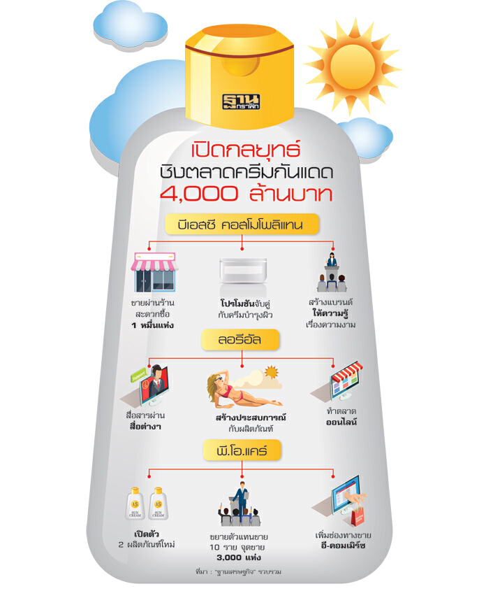 ตลาดผลิตภัณฑ์กันแดดมูลค่ากว่า 4,000 ล้านบาท ในปีนี้มีแนวโน้มเติบโตมากกว่า 10% จากสภาพอากาศที่ร้อนจัด ทำให้ผู้บริโภคต้องหันมาดูแลตัวเองมากขึ้น จึงเป็นโอกาสของแบรนด์ต่างๆ ที่จะช่วงชิงส่วนแบ่งและยอดขาย รวมทั้งสร้างแบรนด์ให้เป็นที่รู้จัก ไม่ว่าจะเป็นแบรนด์บีเอสซี คอมโมโพลิแทน ที่ปูพรมสินค้าไปยังช่องทางร้านสะดวกซื้อกว่า 1 หมื่นแห่ง ค่ายลอรีอัลมุ่งสร้างประสบการณ์และใช้คอนเทนต์เป็นกลยุทธ์ดึงยอดขาย ส่วนพี.โอ.แคร์ ที่ประกาศรุกตลาดออนไลน์เต็มตัว