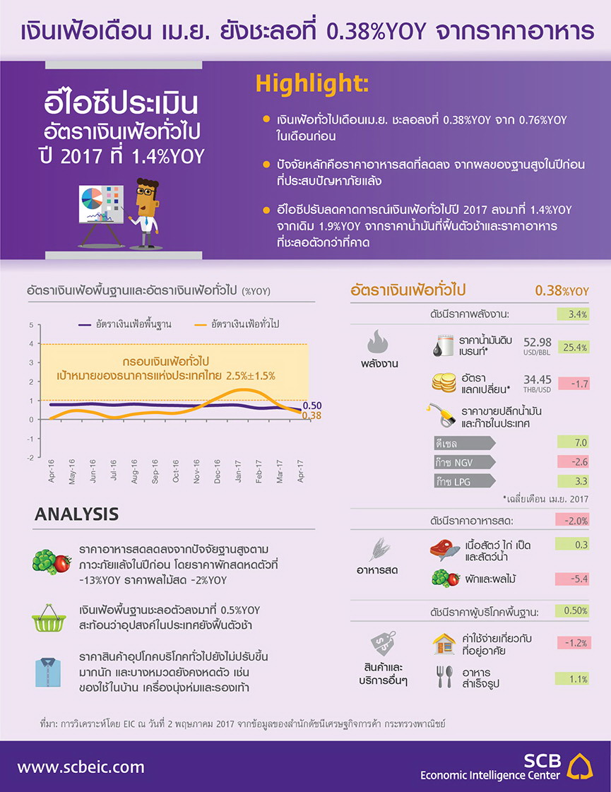 อีไอซีปรับลดคาดการณ์อัตราเงินเฟ้อทั่วไปทั้งปี 2017 ลงมาที่ 1.4%YOY จากเดิม 1.9%YOY เนื่องจากราคาน้ำมันดิบในตลาดโลกฟื้นตัวได้ช้ากว่าที่คาด และค่าเงินบาทที่แข็งค่าขึ้นซึ่งอาจมีผลให้ราคาสินค้านำเข้ามีราคาถูกลง รวมไปถึงราคาอาหารสดหลายชนิดที่ชะลอลงกว่าที่คาด อย่างไรก็ตาม อีไอซีมองว่าอุปสงค์ในประเทศจะทยอยฟื้นตัวขึ้นอย่างค่อยเป็นค่อยไป รวมทั้งราคาน้ำมันดิบก็ยังมีแนวโน้มอยู่ในระดับสูงกว่าปีก่อน คาดว่าเฉลี่ยทั้งปีอยู่ที่ 55 ดอลลาร์สหรัฐฯ ต่อบาร์เรล