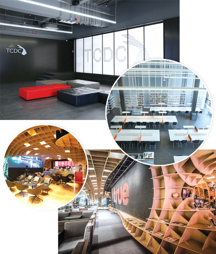 โดยแบ่งศูนย์สร้างสรรค์ออกเป็น 4 ส่วน คือ 1.Creative Vision โครงการศึกษาวิจัยและการร่วมมือกับหน่วยงานภาครัฐในการพัฒนาฐานข้อมูล นโยบายและมาตรการต่าง ๆ เพื่อการพัฒนาเศรษฐกิจสร้างสรรค์ ,2.Creative Center โครงการศึกษาวิจัยและการร่วมมือกับหน่วยงานภาครัฐในการพัฒนาฐานข้อมูล นโยบายและมาตรการต่าง ๆ เพื่อการพัฒนาเศรษฐกิจสร้างสร้าง ประกอบด้วยพื้นที่บริการเดิมอย่างห้องสมุด (เพิ่มพื้นที่นั่งจาก 120 เป็น 300 ที่นั่ง) นิทรรศการ และโคเวิร์คกิ้งสเปซ แต่เพิ่ม 3 พื้นที่บริการใหม่ได้แก่พื้นที่ให้คำปรึกษาธุรกิจห้องปฏิบัติการและศูนย์วัสดุและนวัตกรรม, 3.Creative Business แหล่งเรียนรู้ด้านการออกแบบและความคิดสร้างสรรค์ ที่จัดเตรียมทรัพยกรสารสนเทศสำหรับการค้นคว้าด้วยตัวเอง