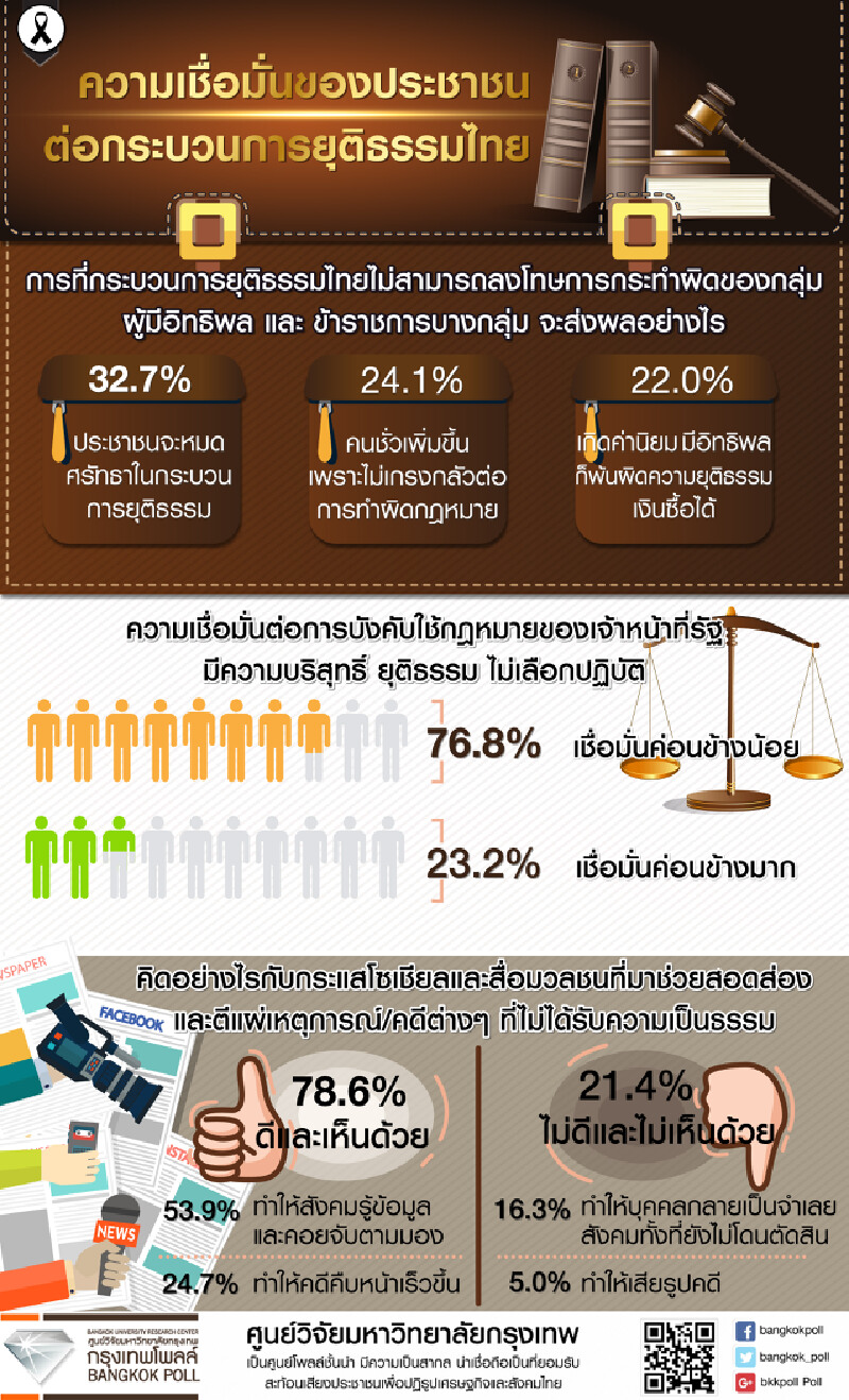 กรุงเทพโพลล์โดยศูนย์วิจัยมหาวิทยาลัยกรุงเทพ ได้ดำเนินการสำรวจความคิดเห็นของประชาชนเรื่อง “ความเชื่อมั่นของประชาชนต่อกระบวนการยุติธรรม” โดยเก็บข้อมูลจากประชาชนอายุ 18 ปีขึ้นไป จากทุกภูมิภาคทั่วประเทศ จำนวน 1,116 คน พบว่า การที่กระบวนการยุติธรรมไทยไม่สามารถลงโทษการกระทำผิดของกลุ่มผู้มีอิทธิพลและข้าราชการบางกลุ่มได้นั้น ประชาชนร้อยละ 32.7 ระบุว่า จะส่งผลให้ประชาชนจะหมดศรัทธาในกระบวนการยุติธรรม รองลงมาร้อยละ 24.1 ระบุว่า จะส่งผลให้คนชั่วเพิ่มขึ้นเพราะไม่เกรงกลัวต่อการทำผิดกฎหมาย และร้อยละ 22.0 ระบุว่า จะส่งผลให้เกิดค่านิยม มีอิทธิพลก็พ้นผิด ความยุติธรรมเงินซื้อได้