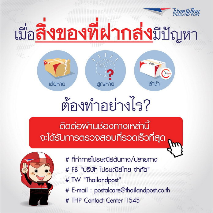 17 พ.ค.60 - บริษัท ไปรษณีย์ไทย จำกัด (ปณท) แนะนำ 5 ช่องทางติดตามสิ่งของที่ฝากส่งทางไปรษณีย์อย่างใกล้ชิด สำหรับผู้ใช้บริการที่ส่งคำร้องหรือขอรับการตรวจสอบกรณีพบสิ่งของที่ฝากส่งมีปัญหา อาทิ สิ่งของที่ฝากส่งถึงปลายทางล่าช้า สิ่งของไม่ถึงปลายทางหรือสูญหาย รวมถึงสิ่งของที่ฝากส่งชำรุดหรือเสียหาย โดยผู้ใช้บริการสามารถติดต่อเพื่อขอรับ การตรวจสอบผ่าน 5 ช่องทาง ดังนี้ 1) ที่ทำการไปรษณีย์ต้นทางหรือปลายทาง 2) เฟซบุ๊ก “บริษัท ไปรษณีย์ไทย จำกัด” www.facebook.com/thailandpost.co.th 3) ทวิตเตอร์ “@Thailandpost” 4) อีเมล์ [email protected] และ 5) THP Contact Center 1545
