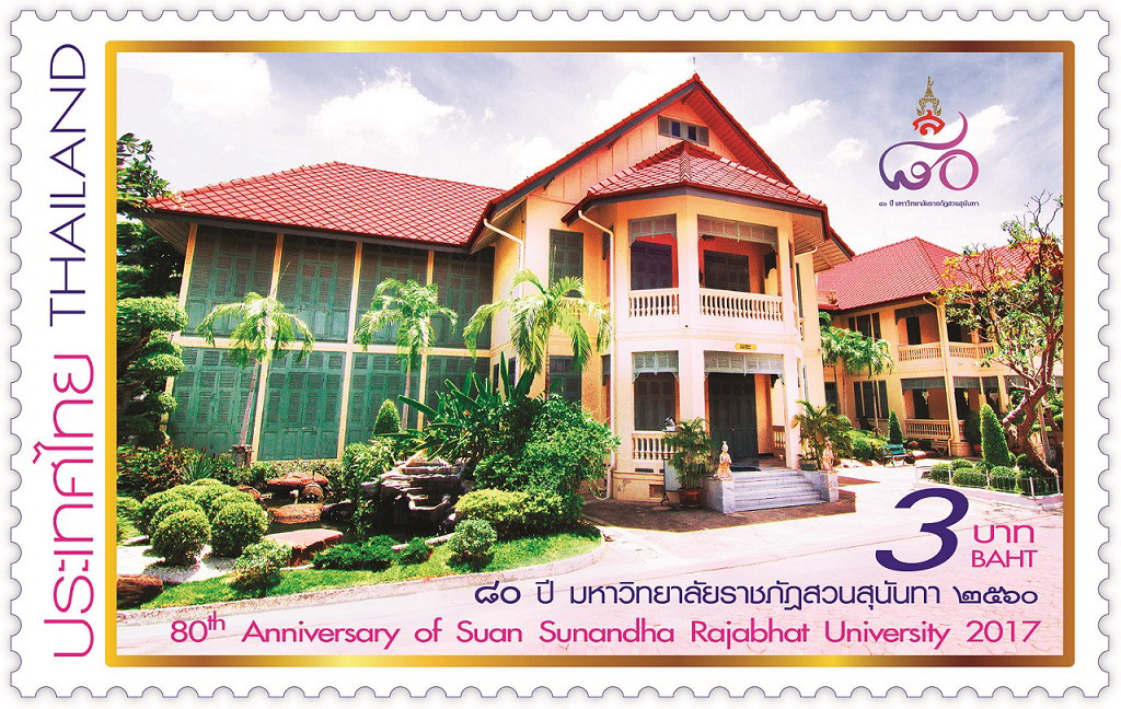 19 พ.ค.60 – บริษัท ไปรษณีย์ไทย จำกัด (ปณท) เปิดตัวตราไปรษณียากร ที่ระลึกครบรอบ 80 ปี แห่งการสถาปนามหาวิทยาลัยราชภัฏสวนสุนันทา นำเสนอภาพพระตำหนักสายสุทธานภดล ที่งดงามด้วยสถาปัตยกรรมแบบเรือนมนิลา พร้อมตราสัญลักษณ์ 80 ปีมหาวิทยาลัยราชภัฏสวนสุนันทา ผู้สนใจสามารถหาซื้อได้ ณ ที่ทำการไปรษณีย์ทั่วประเทศ ในราคาดวงละ 3 บาท เต็มแผ่น 30 บาท (10 ดวง) ซองวันแรกจำหน่าย ภาพสมเด็จพระนางเจ้าสุนันทากุมารีรัตน์พระบรมราชเทวี 11 บาท และอัลบัมชีทชุดพิเศษ 80 บาท