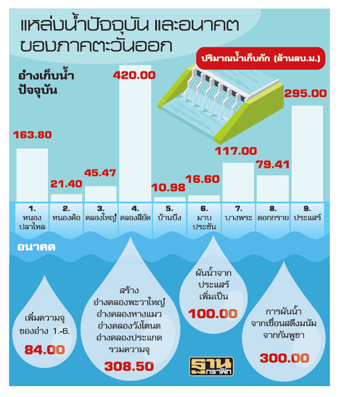 กรมชลประทาน ระดมแผนจัดหาแหล่งน้ำป้อนอีอีซี ชี้ระยะเร่งด่วนต้องขอความร่วมมือเอกชนช่วยจัดหาแหล่งน้ำสำรองมาเสริม ยัน 4-5 ปี สร้างอ่างเก็บน้ำใหม่ 4 แห่งแล้วเสร็จ ในขณะที่รัฐบาลกำลังเร่งขับเคลื่อนการพัฒนาพื้นที่ระเบียงเศรษฐกิจภาคตะวันออกหรืออีอีซี โดยมุ่งเน้น 5 โครงการเร่งด่วน ไม่ว่าจะเป็นการพัฒนาสนามบินนานาชาติอู่ตะเภา การสร้างท่าเรือแหลมฉบัง ระยะที่ 3 โครงการรถไฟความเร็วสูง การชักชวนนักลงทุนเป้าหมายมาลงทุนและการสร้างเมืองใหม่ แต่การเตรียมความพร้อมทางด้านสาธารณูปโภค อย่างการบริหารจัดการน้ำ ก็ถือว่าเป็นเรื่องจำเป็นเร่งด่วนเช่นกัน เพื่อเป็นการสร้างความเชื่อมั่นให้กับนักลงทุนว่า จะมีปริมาณเพียงพอรองรับกับความต้องการที่เกิดขึ้นได้ ไม่ให้เกิดประวัติศาสตร์ซ้ำรอย เหมือนที่เคยเกิดวิกฤตการขาดแคลนน้ำในภาคอุตสาหกรรมเมื่อปี 2537