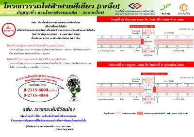 รฟม. แจ้งเบี่ยงจราจรบนถนนรัชดาภิเษก บริเวณสี่แยกรัชโยธิน เพื่อดำเนินการเจาะเสาเข็มทางวิ่งรถไฟฟ้าและสะพานรถยนต์ข้ามแยกรัชโยธิน โครงการรถไฟฟ้าสายสีเขียว (เหนือ) ช่วงหมอชิต – สะพานใหม่ – คูคต ตั้งแต่วันที่ 28 มิถุนายน 2560 – วันที่ 9 กุมภาพันธ์ 2562 เวลา 22.00 น. เป็นต้นไป ตลอด 24 ชั่วโมง