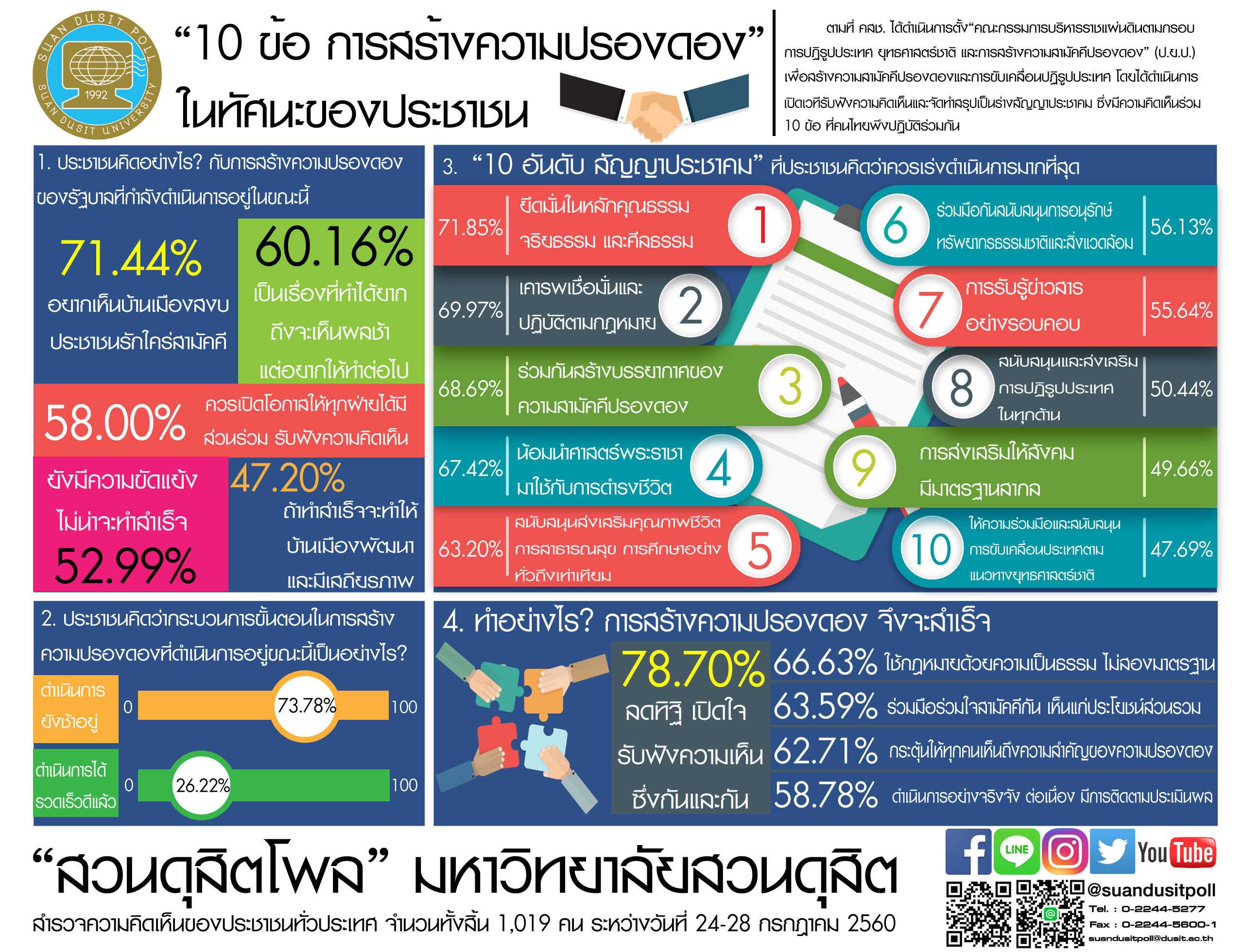 “สวนดุสิตโพล” มหาวิทยาลัยสวนดุสิต ได้สำรวจความคิดเห็นของประชาชนทั่วประเทศ จำนวนทั้งสิ้น 1,019 คน ระหว่างวันที่ 24-28 กรกฎาคม 2560 สรุปผลได้ ดังนี้